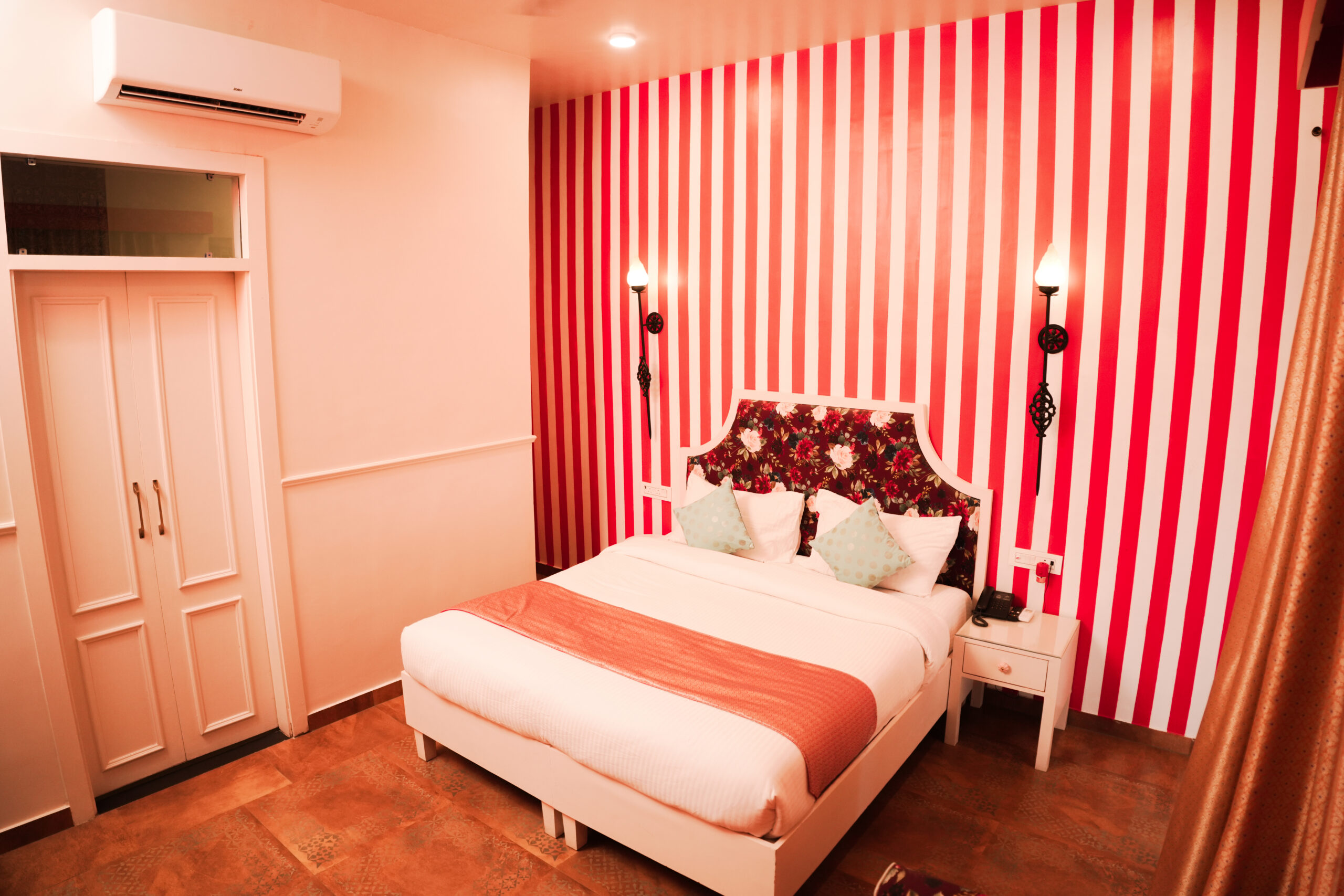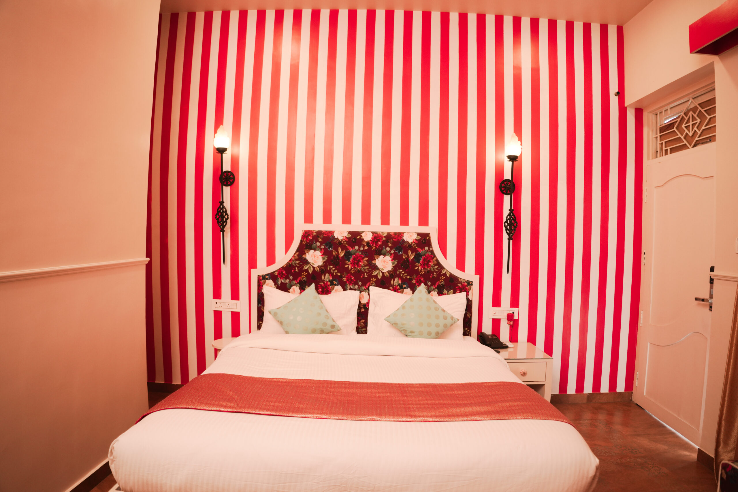 Playful striped accents meet floral upholstery and warm lighting. This room balances symmetry and creativity, offering a refined yet spirited atmosphere.